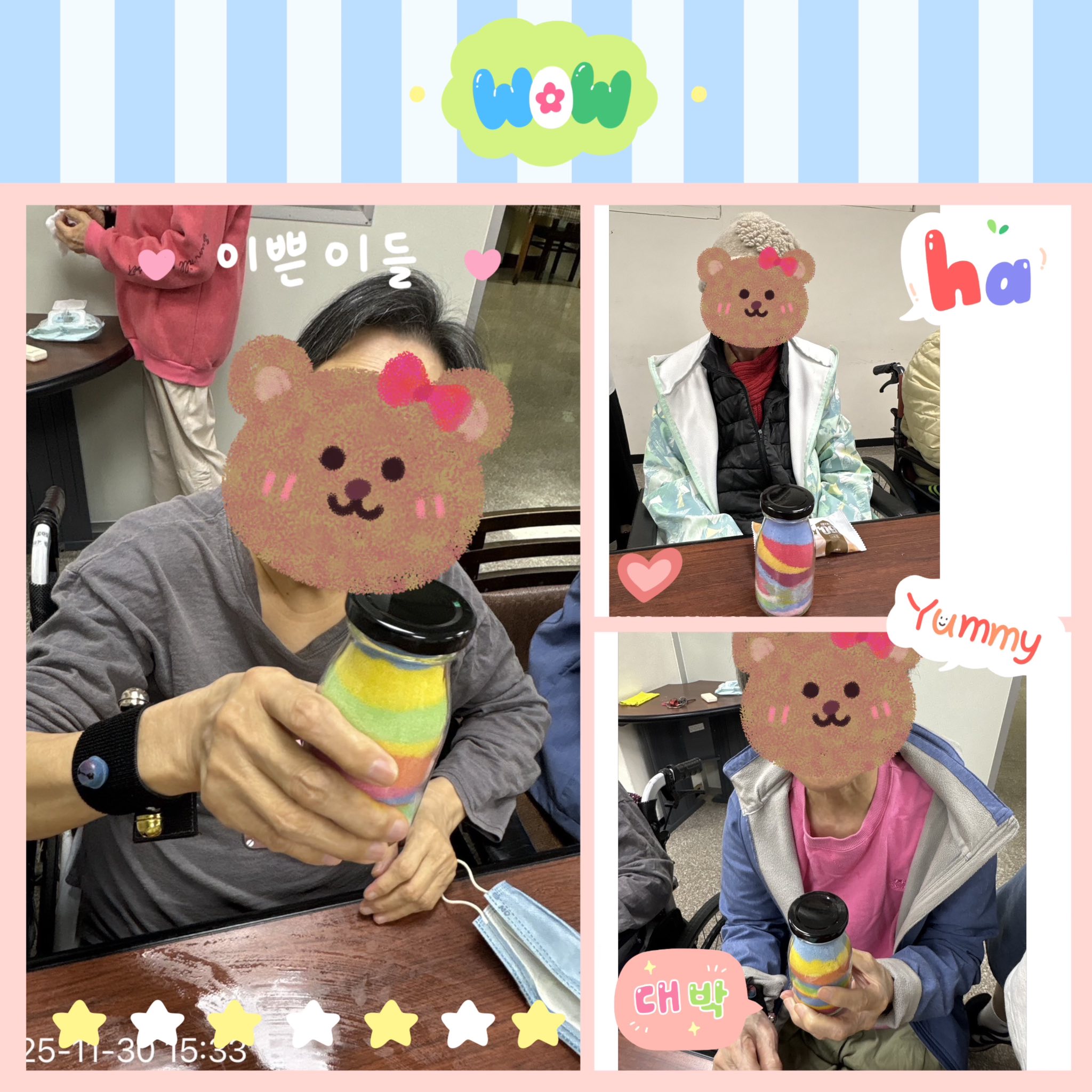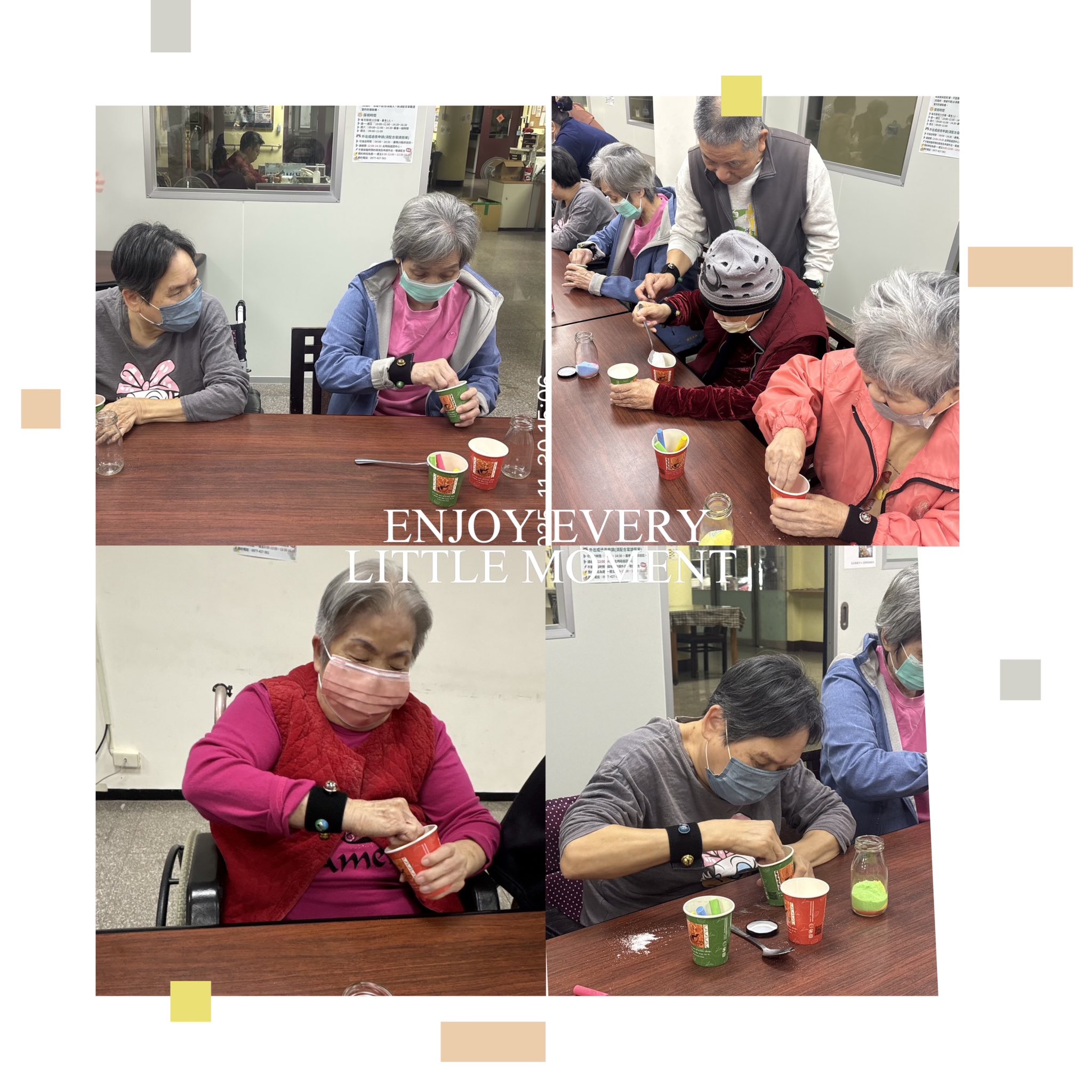 【長輩創意手作|志工陪伴一起做瓶中彩色沙】 長輩在福田基金會志工陪伴下製作瓶中彩色沙。 用粉筆將白鹽磨成彩色粉末,再一層層倒入玻璃瓶中,創造專屬漸層作品。 一邊聊天、一邊挑色,現場充滿溫暖與笑聲,每一瓶都是療癒又美麗的小禮物。